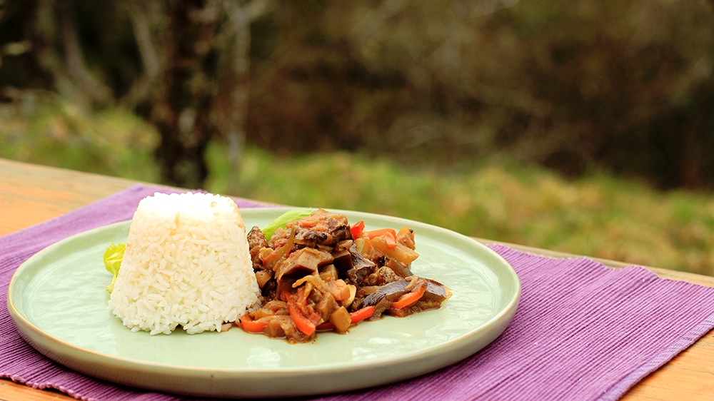 Verduras de estación y callampas deshidratadas se combinan en este exquisito guiso…y qué mejor que acompañarlo con arroz blanco, bien blanco!