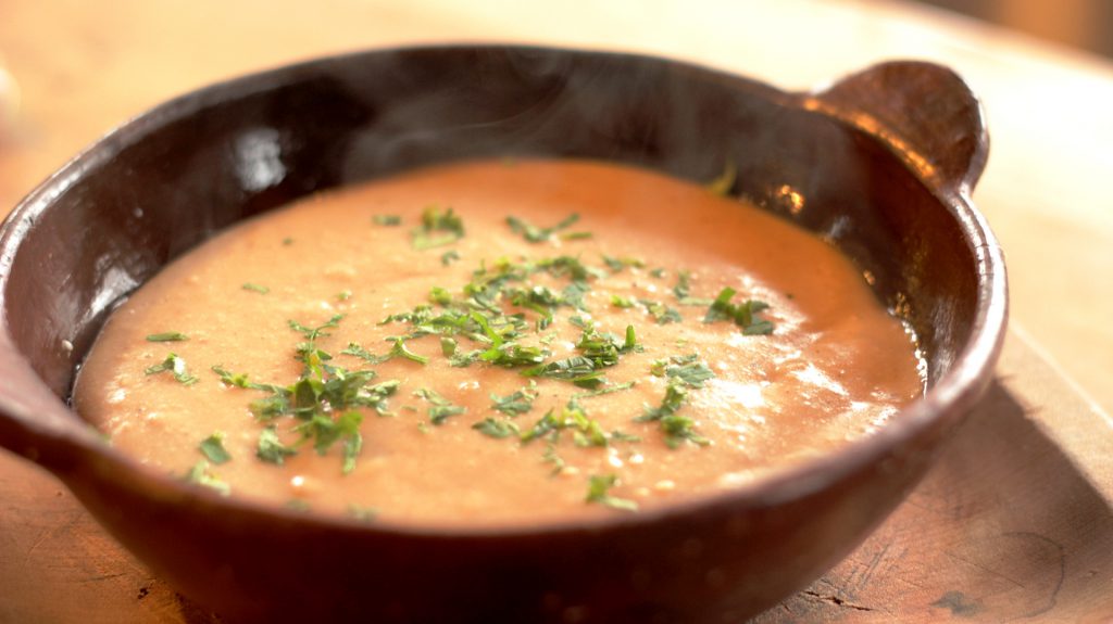 En un molinillo o una procesadora de alimentos moler las avellanas lo más fina posible, ojalá como harina y reservar. Picar la cebolla fina y sofreír en un poco de aceite. Opcionalmente se puede agregar al sofrito tallos de perejil picados que aportan un buen sabor. Una vez que la cebolla esté transparente aliñar con sal y pimienta, agregar el agua, calentar un poco e incorporar las avellanas molidas, disolver bien y dejar que suelte un hervor. Incorporar la leche y calentar a fuego suave hasta antes que vuelva a soltar el hervor. Servir bien caliente con perejil picado y una copita de vino!
