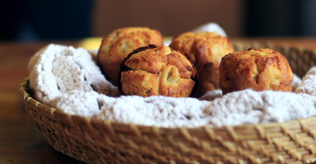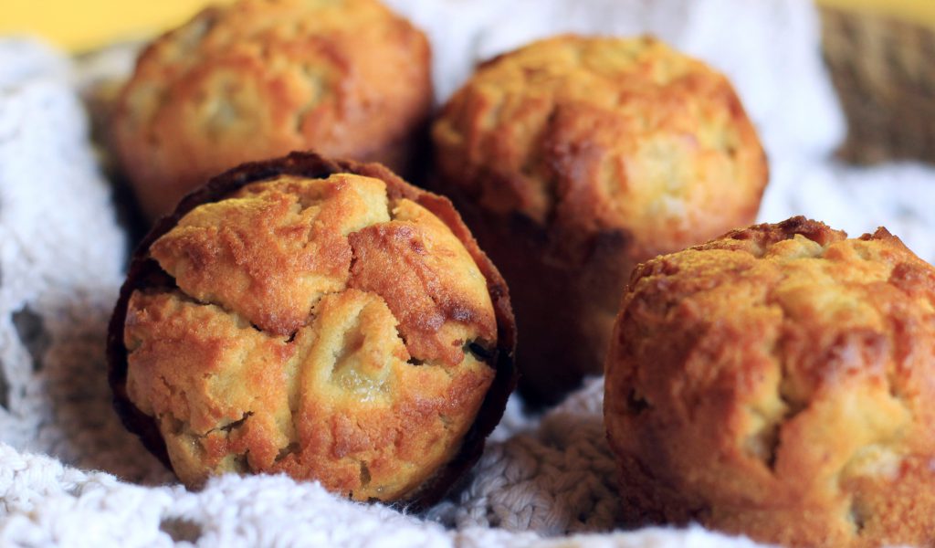 Precalentar el horno a 180º. En un bowl juntar las harinas y los polvos de hornear. En otro batir levemente los huevos, agregar el azúcar, el aceite, la leche y mezclar bien. Juntar todo y agregar los plátanos cortados en cubos pequeños. Dividir la mezcla en moldes para muffins y hornear por 20 minutos.